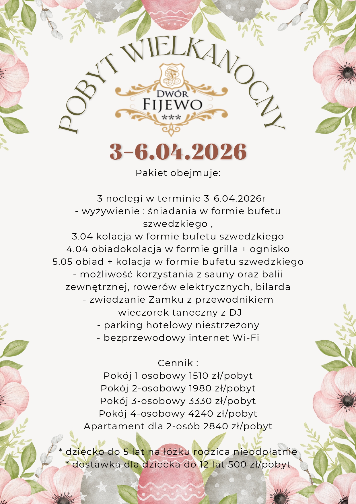 Dwór Fijewo zaprasza na wyjątkowy pobyt Wielkanocny w terminie 3-6.04.2026r pełen smaku, spokoju i rodzinnych chwil.